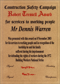 Des Warren was one of the pickets jailed at Shrewsbury following the national building workers strike of 1972. His trial on conspiracy charges was part of the attempt by the Tory government of the day to destroy basic trade union rights. Although jailed by the Tories, it was a Labour government that allowed Des Warren to serve two and a half years in prison. The TUC leadership refused to lift a finger, rejecting demands for a general strike to free him. Des suffered permanent injury to his health from drugs administered in jail and ultimately this led to his death in April 2004. The lessons of his experience are invaluable for anyone wanting to fight against the return of poor conditions in the building trades and other industries. |